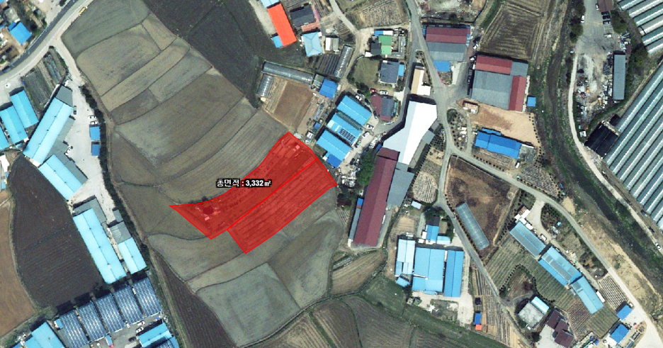 본건 토지 급매 물건의 항공 사진입니다, 사진에서 보시는 봐와 같이 주변은 공장 창고들이 한참 들어서 하루가 다르게 지가가 상승하는 투자 유망 지역입니다.