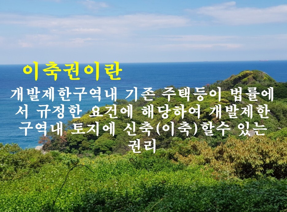 이축권이란 개발제한구역 내의 주택 소유자가 인근 다른 개발제한구역 내에 건축 허가를 받아 주택을 옮겨 지을 수 있는 권리를 말합니다.