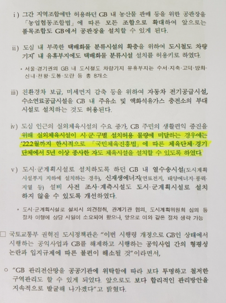 개정된 개특법 시행령에서 공익사업으로 인해 개발제한구역에서 해제된 지역에 위치한 주택 및 근린생활시설의 신축 요건에 법률의 개정 사항을 반영하고, 개발제한구역 관리 전산망 운영의 수탁기관을 정하는 등 법률에서 위임된 사항과 그 시행에 필요한 사항을 정하는 한편, 개발제한구역 안에 있는 허가 받은 건축물의 담장 설치 절차를 간소화하고, 존속 중인 건축물 등에 관한 특례 대상을 추가하며, 도시ㆍ군 계획 시설로 설치하지 않을 수 있는 시설을 추가하고, 개발제한구역 내 건축물 등의 설치 요건을 완화하는 등 현행 제도의 운용상 나타난 일부 미비점을 개선·보완하려는 것을 목적으로 개정되었습니다.