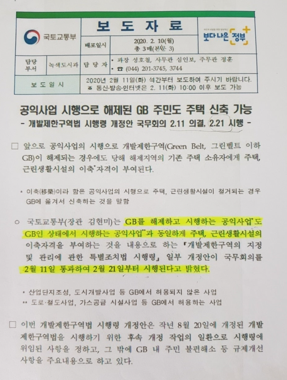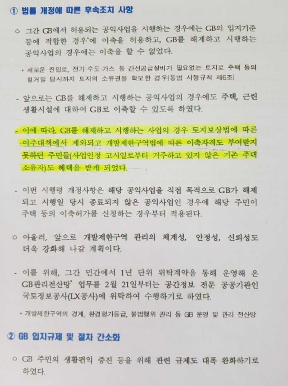 개특법 시행령이 개정되기 전에는 "기존 주택이 「공익사업을 위한 토지 등의 취득 및 보상에 관한 법률」에 따른 공익사업" "기존 근린생활시설이 「공익사업을 위한 토지 등의 취득 및 보상에 관한 법률」에 따른 공익사업"을에 따른 법령에 의해 공익사업으로 인해 개발제한구역이 해제된 경우 이축권을 부여하지 않았지만 2020년 2.18일 개특법 시행령이 개정된 후 "기존 주택(공익사업의 시행으로 개발제한구역에서 해제된 지역의 기존 주택을 포함한다)이 공익사업"으로 하고, "기존 근린생활시설(공익사업의 시행으로 개발제한구역에서 해제된 지역의 기존 근린생활시설을 포함한다)라고 개정되어 많은 분들이 혜택을 누리고 있는 것입니다.