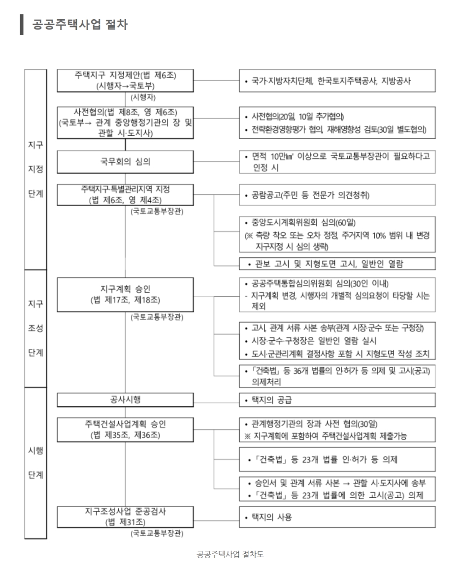 공공 주택 지구란? 공공 주택의 공급을 위하여 공공 주택이 전체 주택 중 100분의 50 이상이 되고, 국토교통부 장관이 공공 주택 지구 조성 사업을 추진하기 위하여 지정 ․ 고시하는 지구를 말한다. 공공 주택 지구는 국토교통부 장관이 지정하거나 변경 또는 해제할 수 있다. 국토교통부 장관은 주택 지구를 지정하거나 지정된 주택 지구를 변경하려면 중앙도시계획위원회의 심의를 거쳐야 한다. 근거법은 공공 주택 특별법이다.